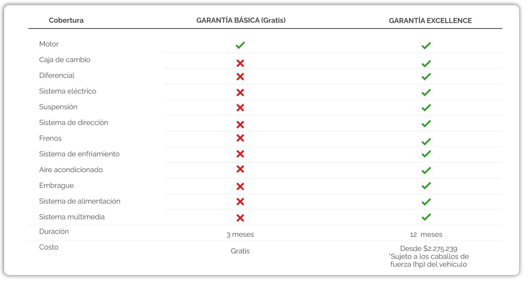 Protege tu vehículo con nuestra garantía extendida gratuita por 3 meses y cubre las piezas más costosas del motor. O elige la Garantía EXCELLENCE con una cobertura y beneficios superiores. Ver T&C.